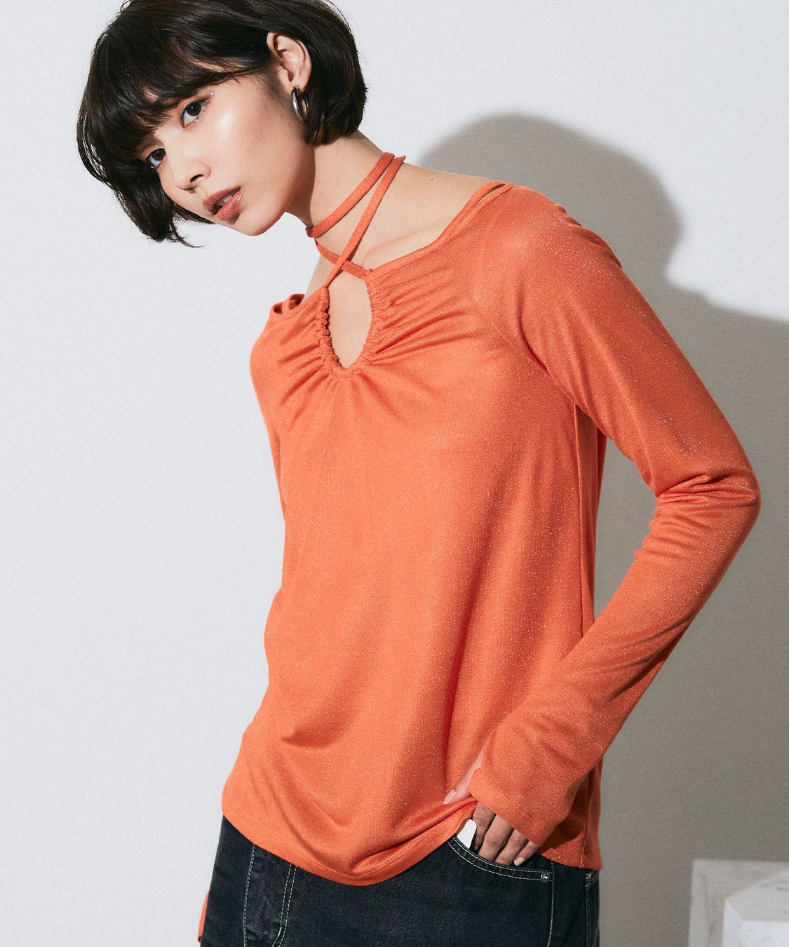 首元のホルターや細かいデティールにこだわったデザイントップス。細かなラメがさりげなく可愛いアイテムです