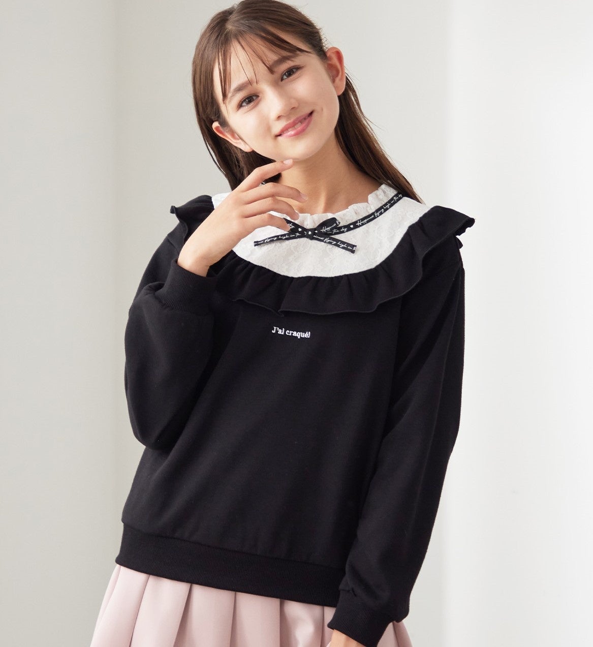ラウンドしたフリルがポイントのトップスは、レース切替とリボンタイでガーリ度アップ。どんなボトムとも合せやすいアイテムです。レイヤー風の切替で小顔効果も。甘めにプリーツスカート等で合せたガーリーコーデにはもちろん、カジュアルなデニムやショートパンツと合せてカジュアルガーリースタイルも◎。