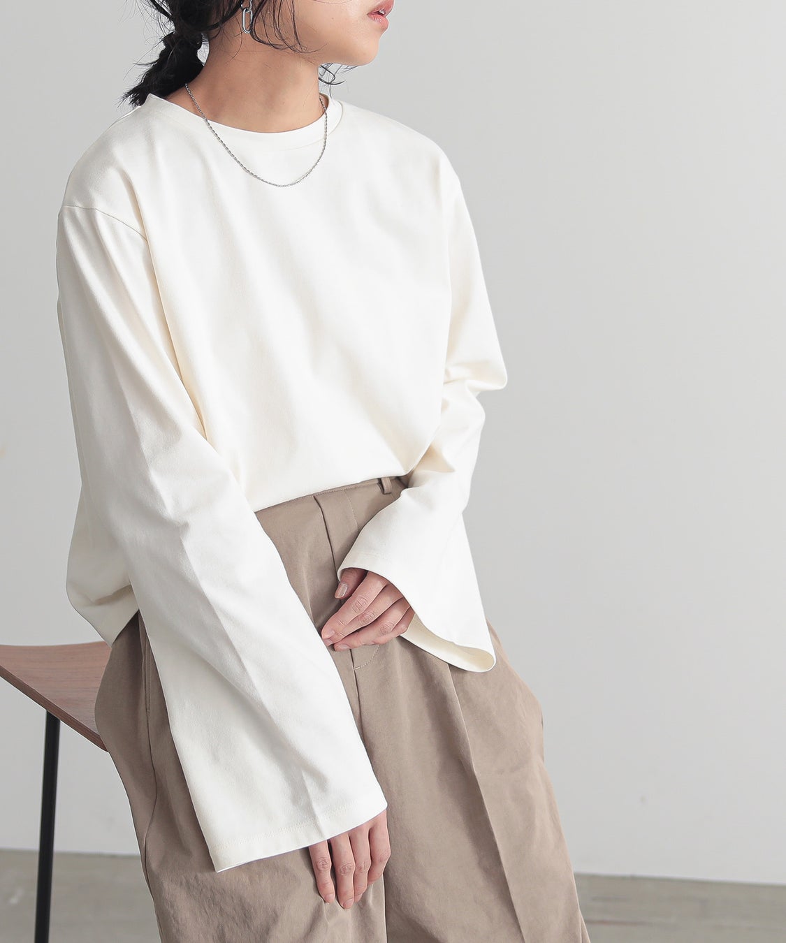 シンプルながらデザイン性があり一枚でも華やかに着こなせるアイテム。ゆったりしたシルエットとワイドスリーブで華奢見えするのが嬉しいポイント。