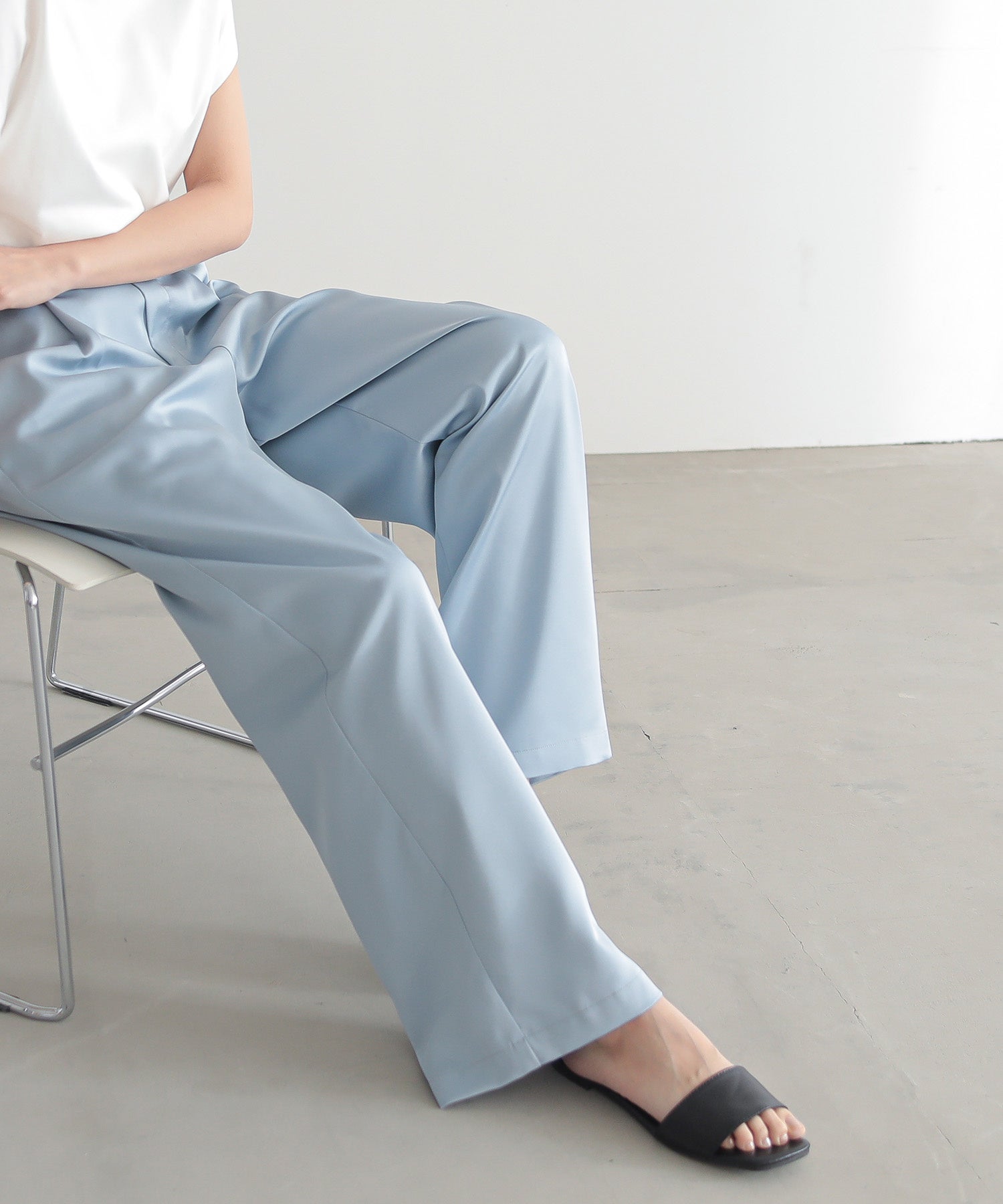 人気のサテンパンツがきれいめ仕様にアップデートして登場しました。程よい光沢感で大人が履きやすく、ウエストはゴム仕様なので機能性も兼ね備えたアイテムです。太すぎないストレートシルエットは様々なスタイリングで活躍します。