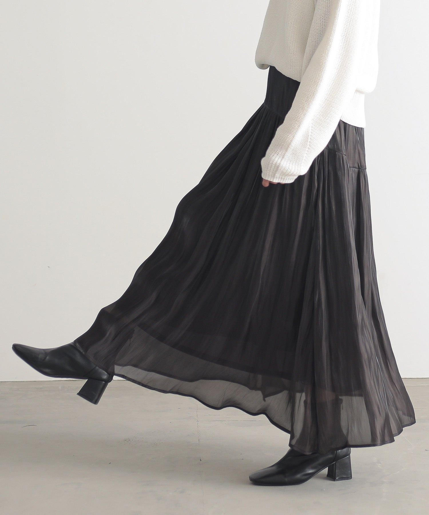 つやのある光沢感と表情のあるシワ感が魅力の素材のスカートです。動きに合わせて表情の出る映えデザインはいつものコーデを華やかにしてくれる優秀アイテムです。