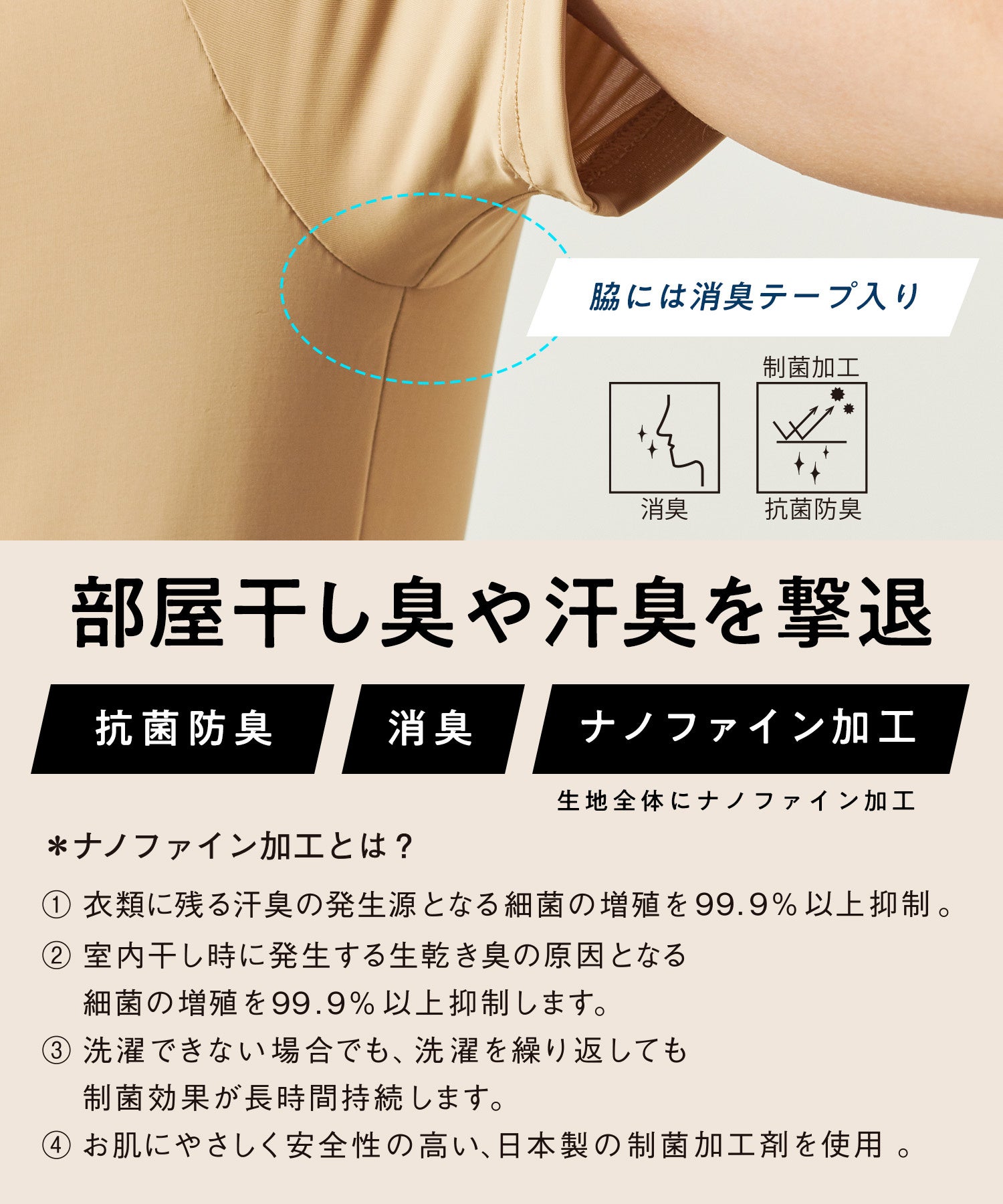 「KEEP GUARD -シームレス-」同様、生地全体にナノファイン加工を施し、部屋干し臭や汗臭を撃退します。また脇には消臭テープが仕込まれており、気になる脇汗臭も防いでくれます。透けだけでなく臭いエチケットにも効果のあるアイテムです。