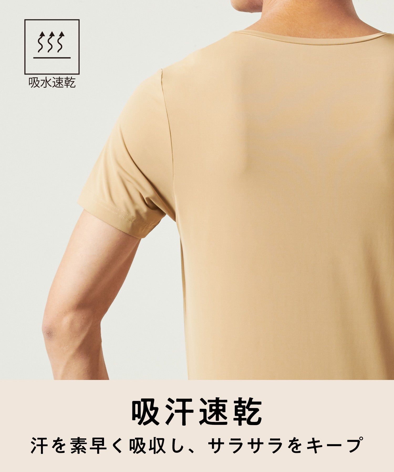 凹凸加工を施したワッフル生地を2枚重ね、徹底的に透けを防止する設計です。黒・白・ベージュの3色展開で、ベージュを着用することにより乳首だけでなくインナーの透けも防いでくれます。バレずにカッコよく透けをケアしてくれる男性の味方です。