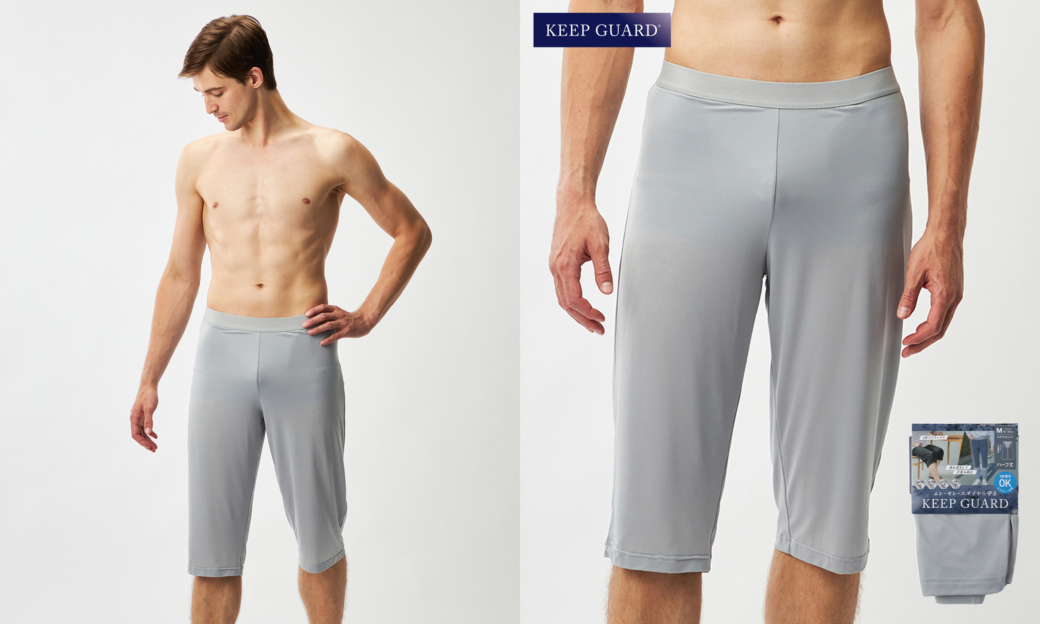 吸水生地と防水布を重ねた“ふんどし安心構造”でムレとモレを防ぐアイテムです。「夏はパンツの上にステテコをはいて、ズボンをはいていて、とにかくムレて暑い!」という世のおじさまたちの声から開発しました。(パッド部分には)KEEP GUARDの強みである消臭加工を施した尿モレパッドで、清潔感を保ちます。
