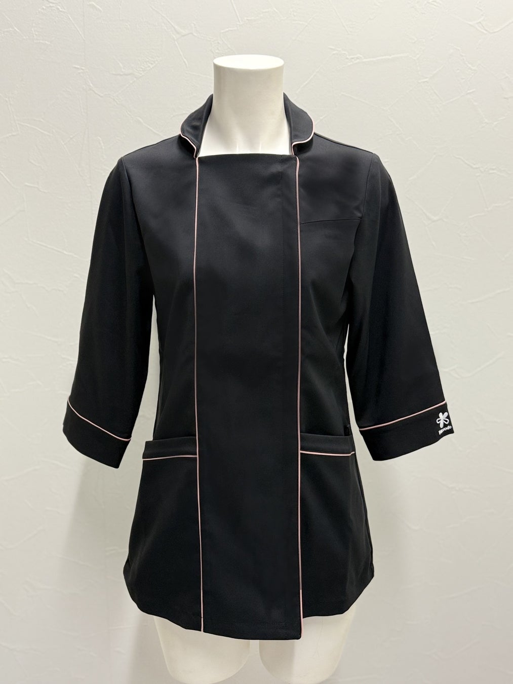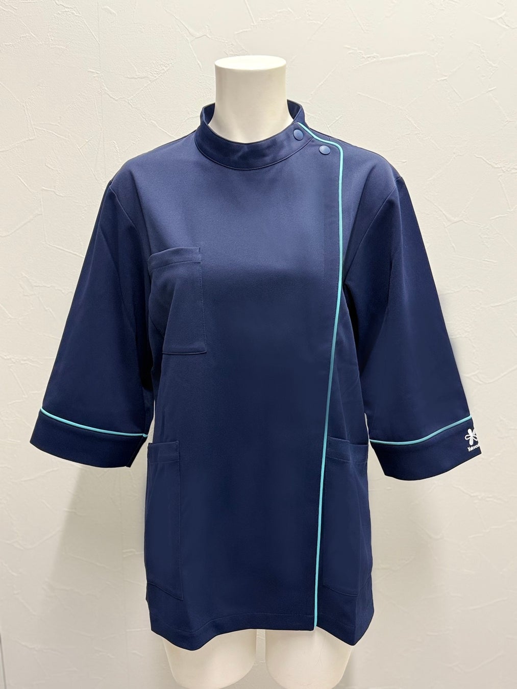 登録販売者用には爽やかなブルー、化粧品担当者用には華やかなピンクのラインをデザインとして施し、それぞれ対象となるお客様に好感を持っていただけるよう工夫しました。また、直線的なカッティングの型により、知性的で安心感のある印象を与えます。化粧品担当者には再生可能な植物由来成分を含む高性能ポリマー繊維素材「Sorona🄬」を採用することで、地球にやさしいユニフォームを実現しました。